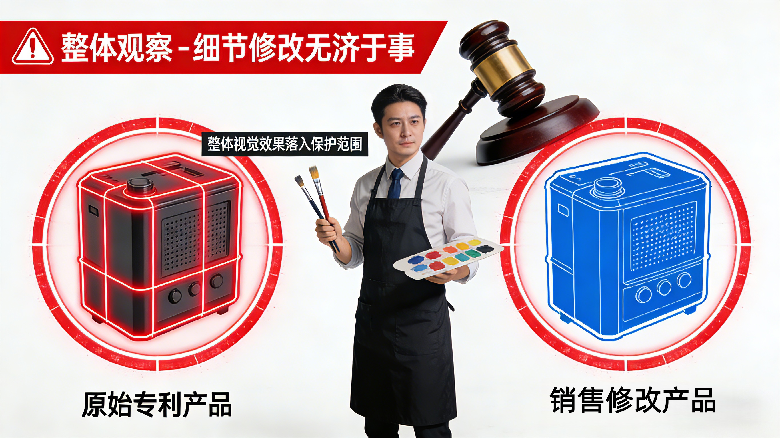 真相: 外观设计专利保护的是产品的整体视觉效果,而非单一要素。在侵权判定中,法官或审查员会进行“整体观察、综合判断”——只要整体视觉效果落入专利保护范围,细节修改往往无济于事。