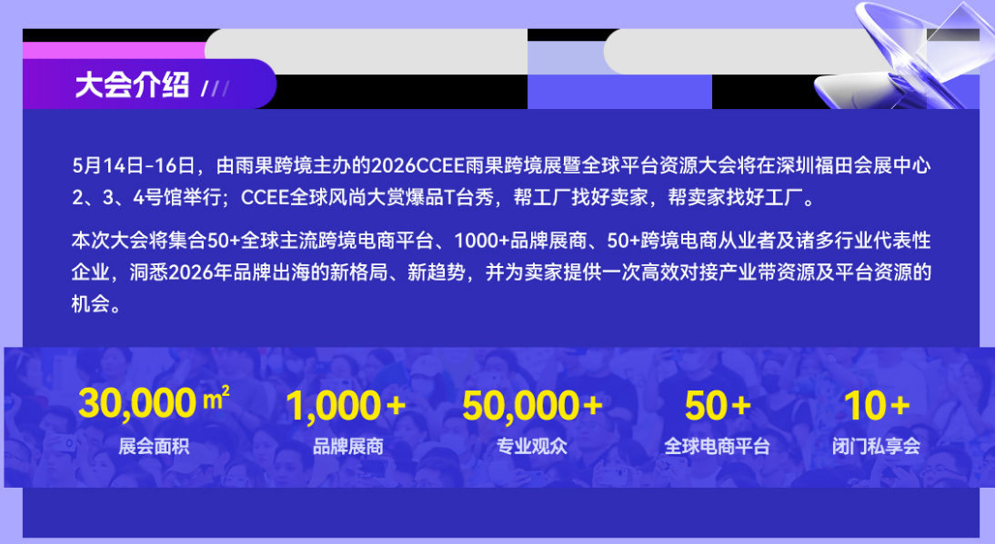 2026年5月14日至16日,由雨果跨境主办的第23届CCEE雨果跨境展暨全球平台资源大会将在深圳福田会展中心2、3、4号馆盛大举行。这场以“链接全球商机,赋能品牌出海”为主题的行业盛会,作为2026年开年首场大型跨境电商选品展之后的重磅续篇,预计将汇聚来自全球的4000余家优质供应商、80多个主流跨境电商平台及200多家全链路服务商,预计吸引专业观众超过50万人次。
