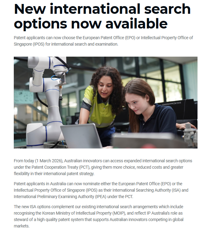 澳大利亚知识产权局官网发布消息称,自2026年3月1日起,澳大利亚的创新者将可通过《专利合作条约》(PCT)获得更为广泛的国际检索选项,此举旨在提供更多选择、降低申请成本并提升操作灵活性。