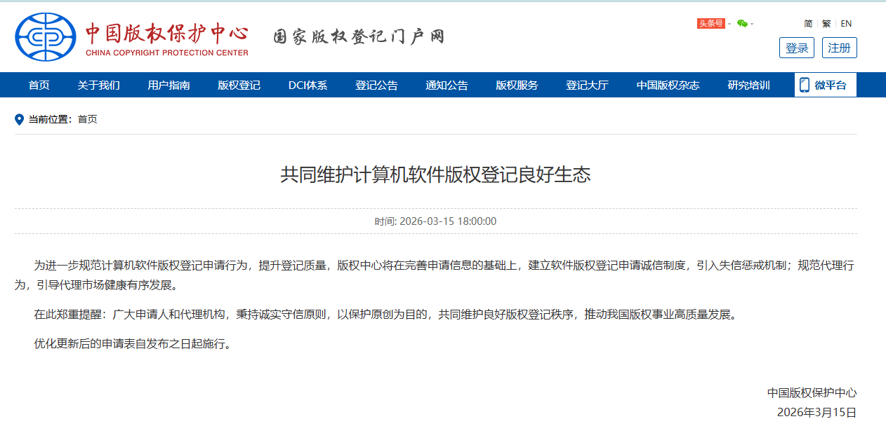 在此背景下,2026年2月14日,中国版权保护中心组织召开专题会议,研究部署对非正常计算机软件版权登记申请的综合施策治理工作,贯彻落实国家版权局《关于加快推进版权事业高质量发展的意见》。3月15日,版权中心正式发布通知,标志着软件著作权登记从形式审查向信用监管转型的制度设计落地实施。