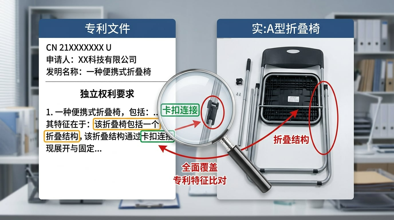 判定:全面覆盖原则——产品包含专利独立权利要求的全部必要技术特征即侵权;缺少任一特征通常不侵权。