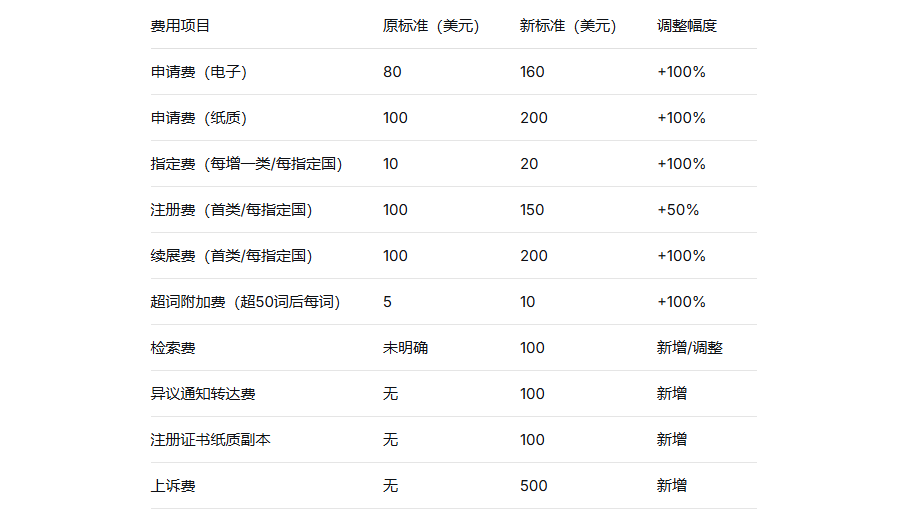 值得注意的是,修订同样适用于在审商标申请。对于已提交但尚未完成注册的申请,注册费缴纳将适用新标准(150美元/首类/指定国),而非原100美元标准。