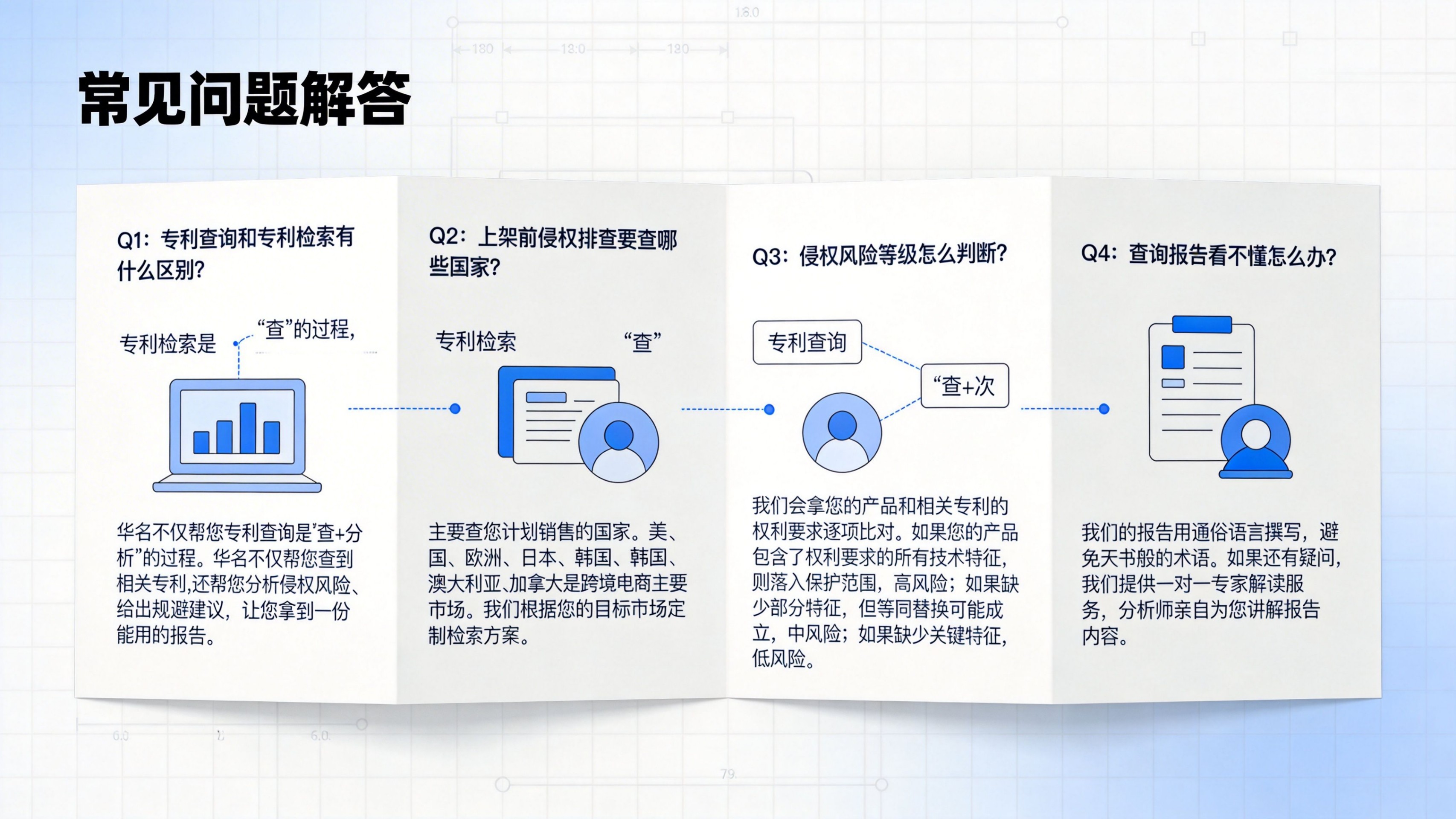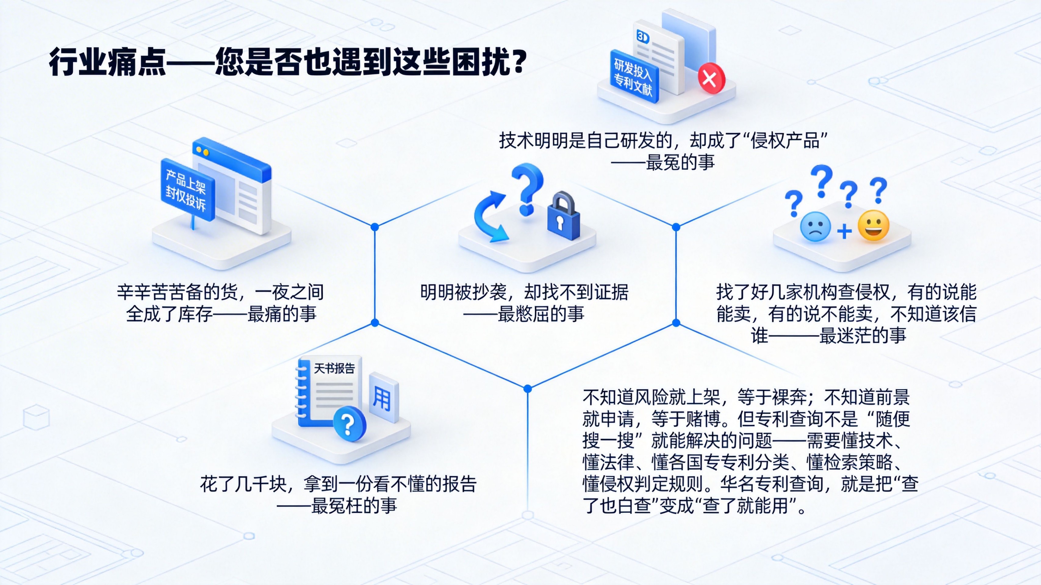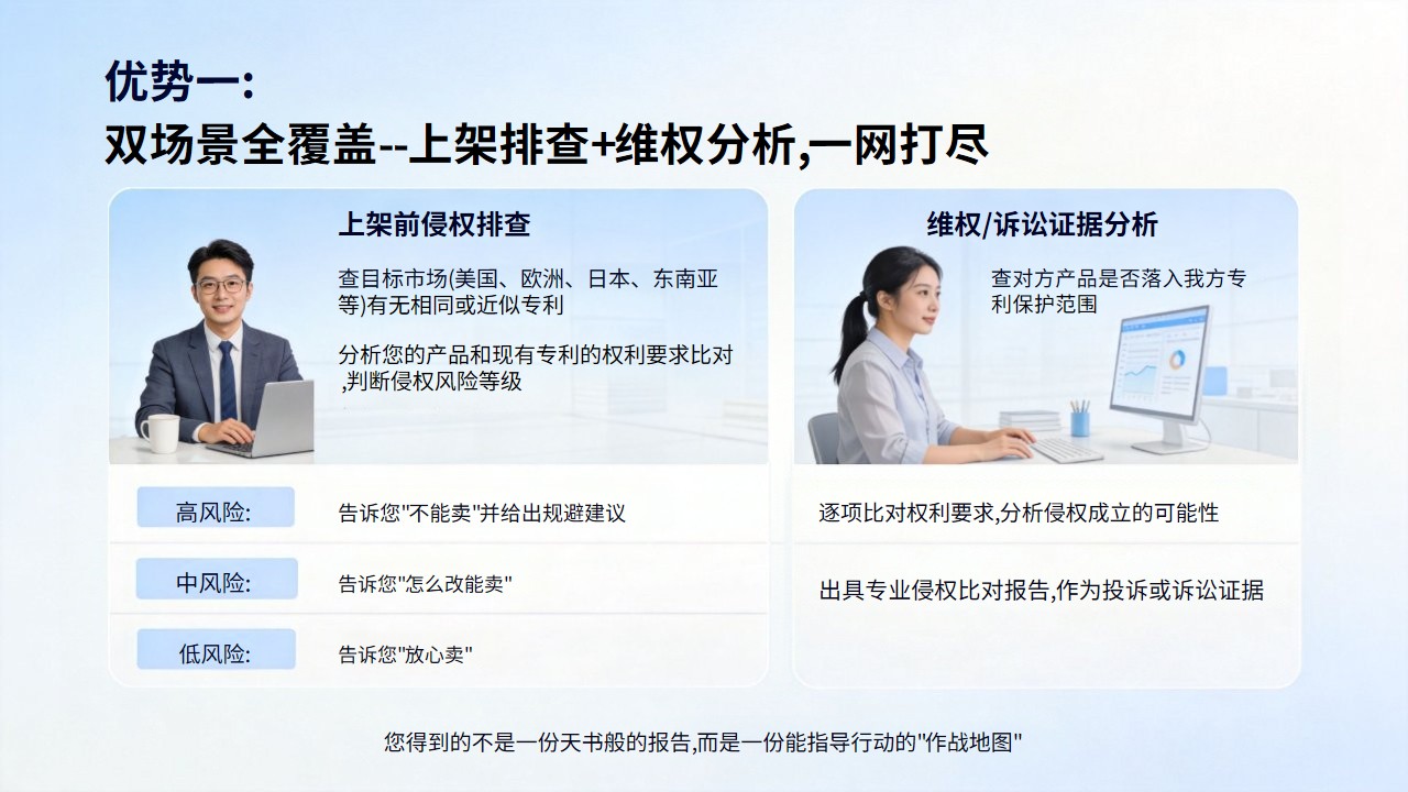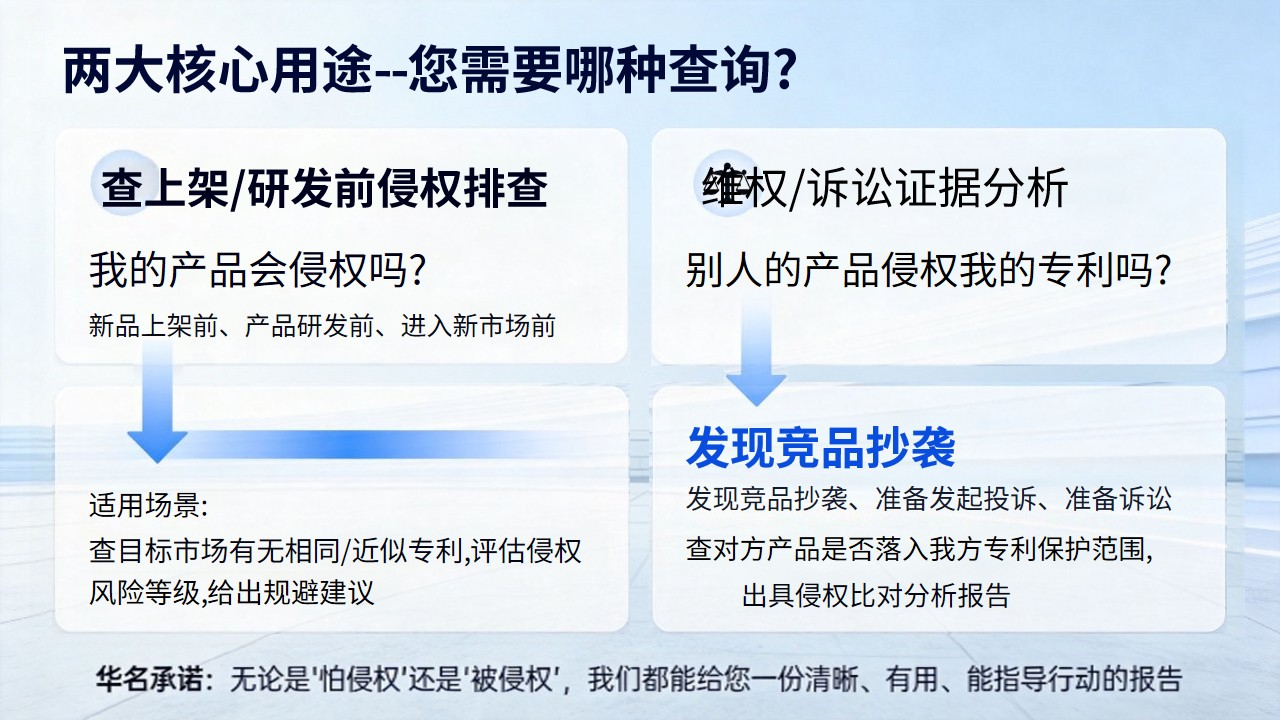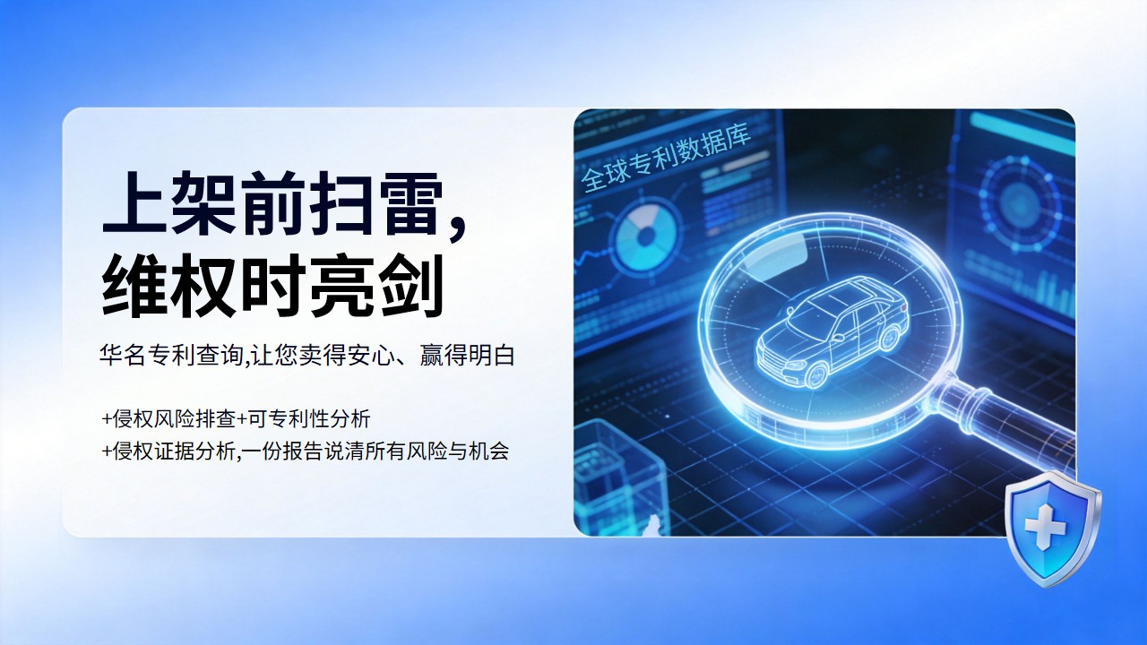 铺货前侵权排查:①新品上架前、铺货前、进入新市场前。②我的产品会侵犯别人的发明专利吗?③查目标市场有无相同/近似功能结构,评估侵权风险,给出上架建议。申请前冲突检索:①准备申请功能结构等发明专利前②我的设计与现有专利冲突吗?能授权吗?③查全球发明专利,评估授权前景,给出申请建议。注意:由于不可抗力,任何查询保证不了100%准确。该查询仅供参考,不作为权威鉴定。