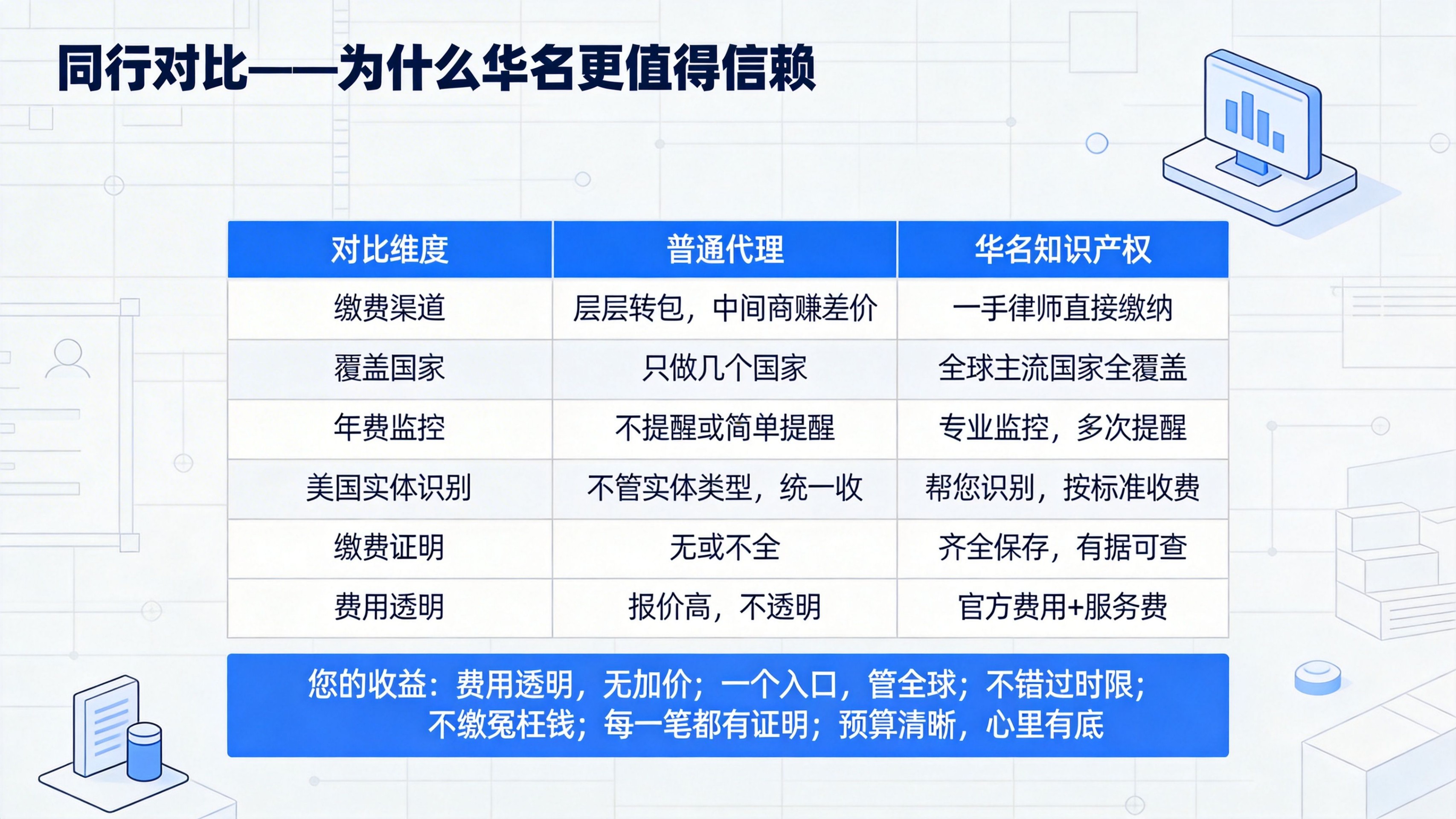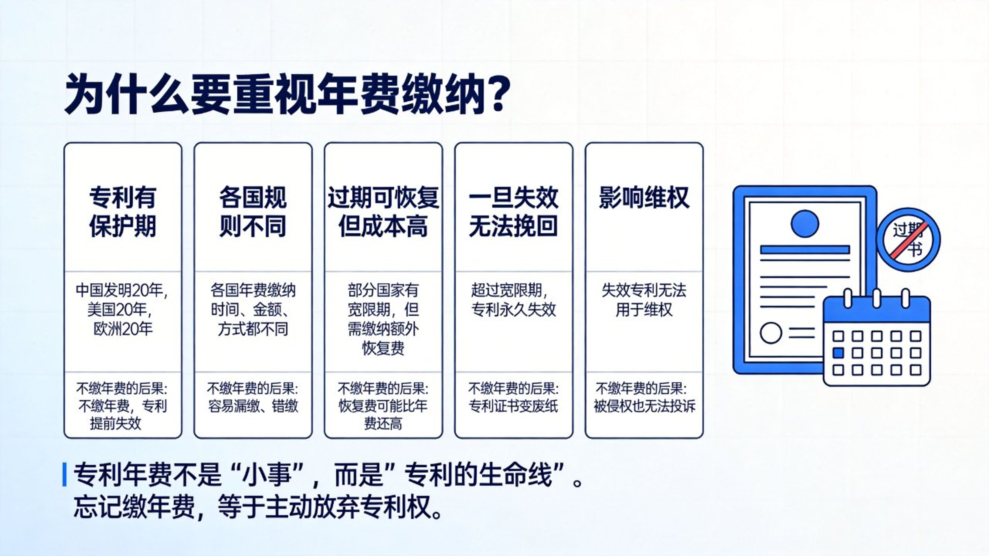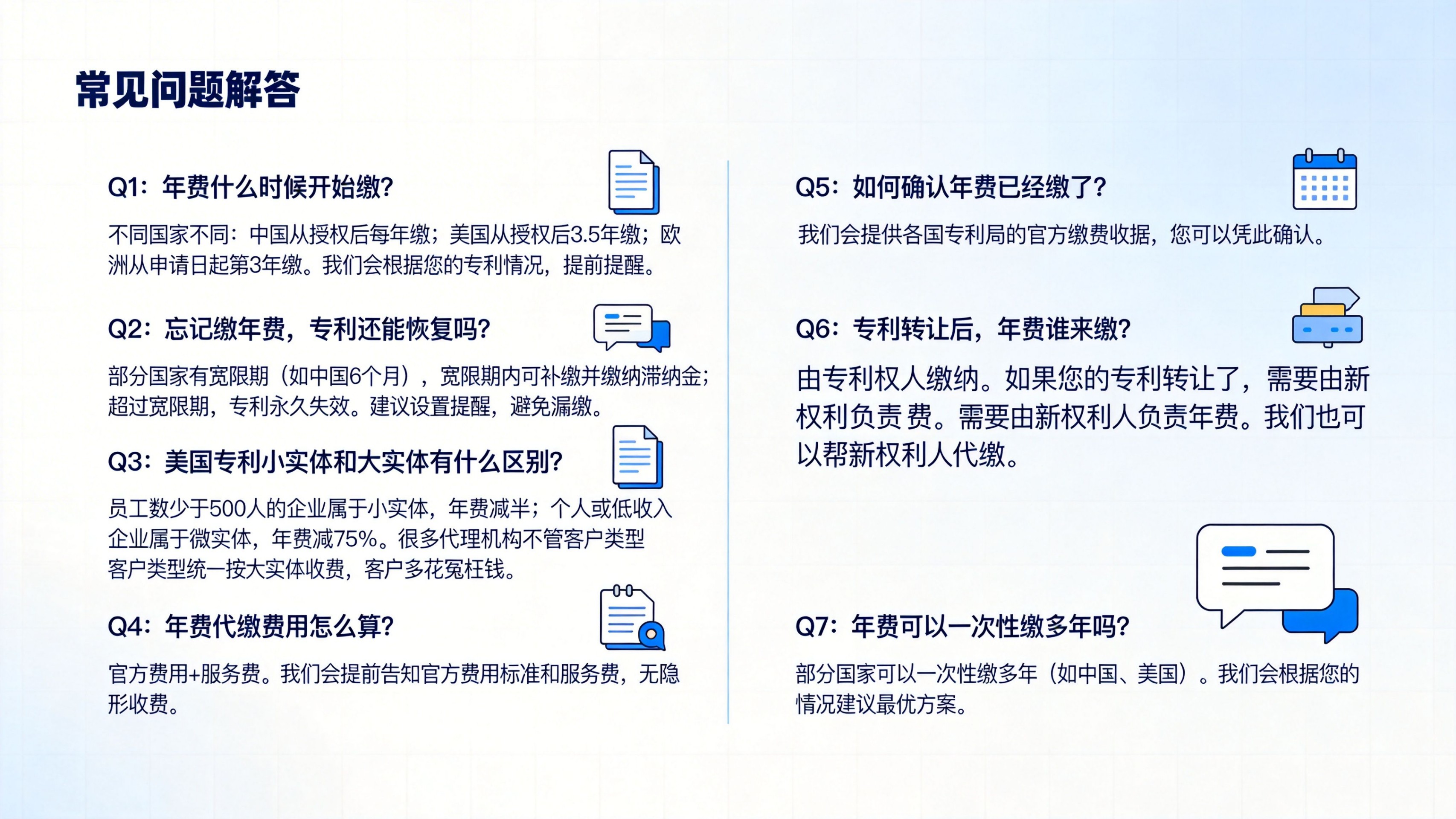 ●中国专利年费每年缴纳一次●美国外观专利无需缴纳年费,发明专利3.5年缴纳一次●欧盟、英国外观每5年缴纳一次各国国家的缴纳时间节点和时间期限不一致,详情请扫码咨询客服