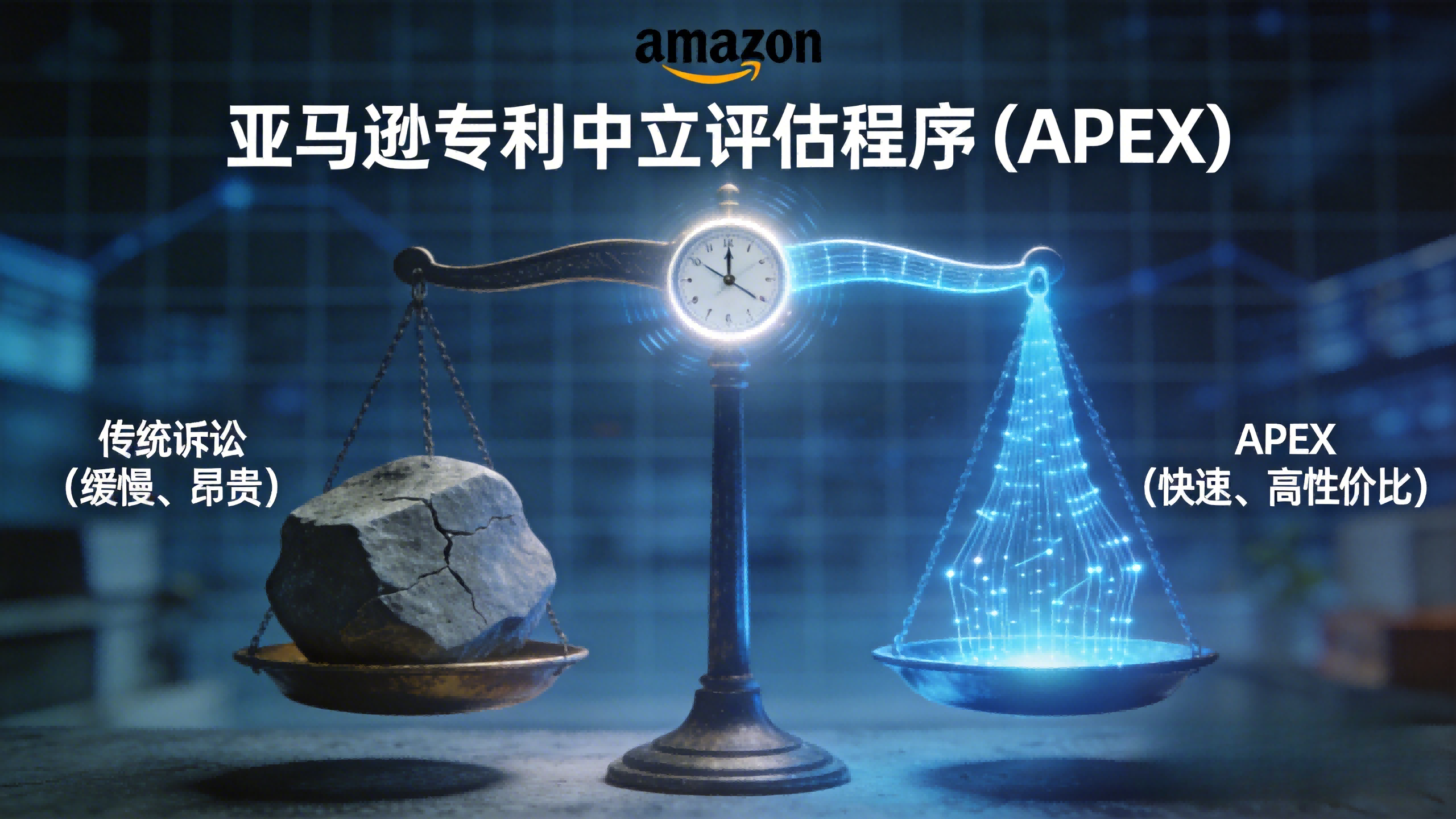 APEX是亚马逊为美国站发明专利侵权争议设立的高效替代诉讼机制,7周出结果、费用仅4000美元/方,适用有效美国发明专利,流程含8步,强调书面答辩与快速执行。